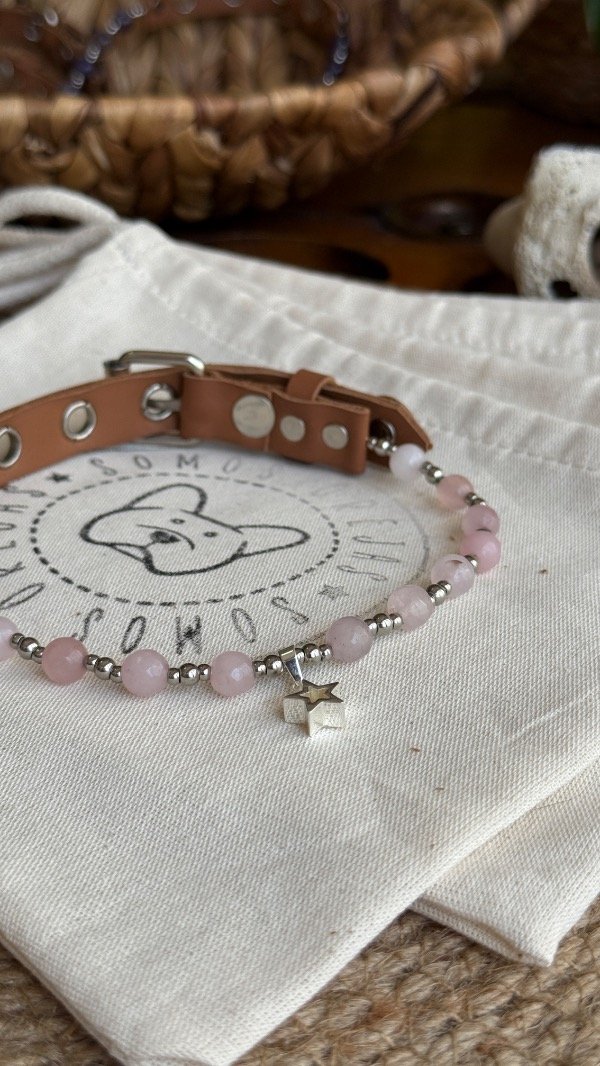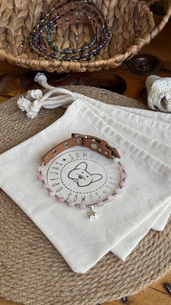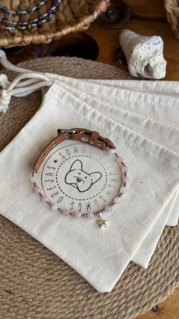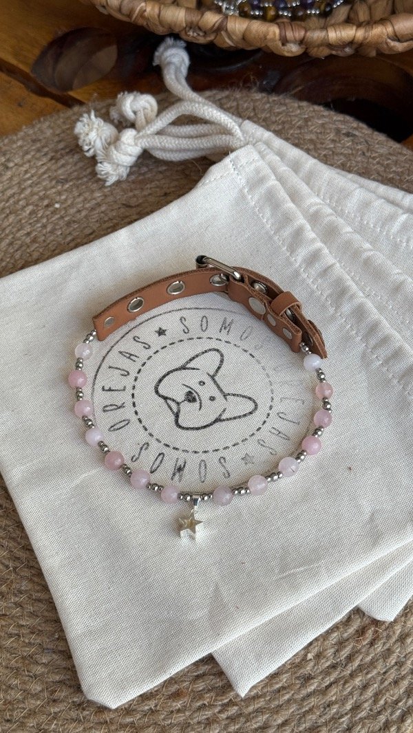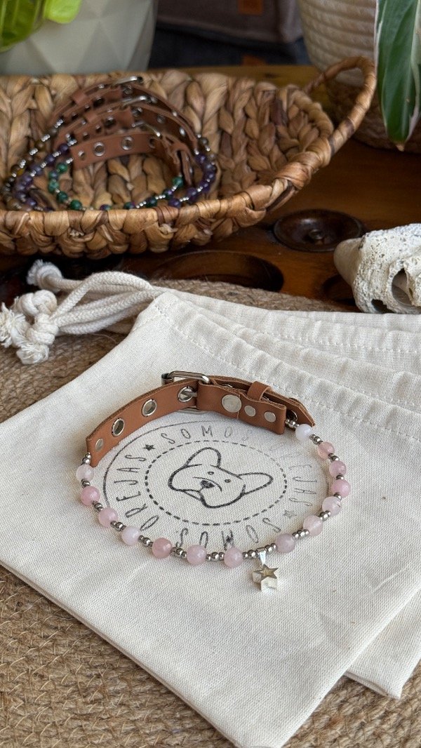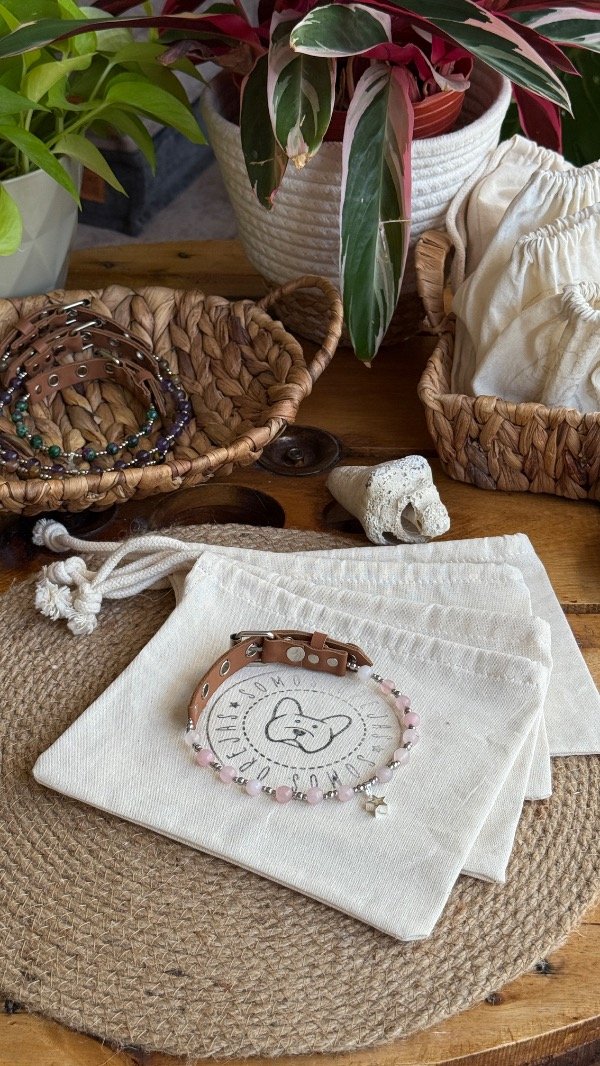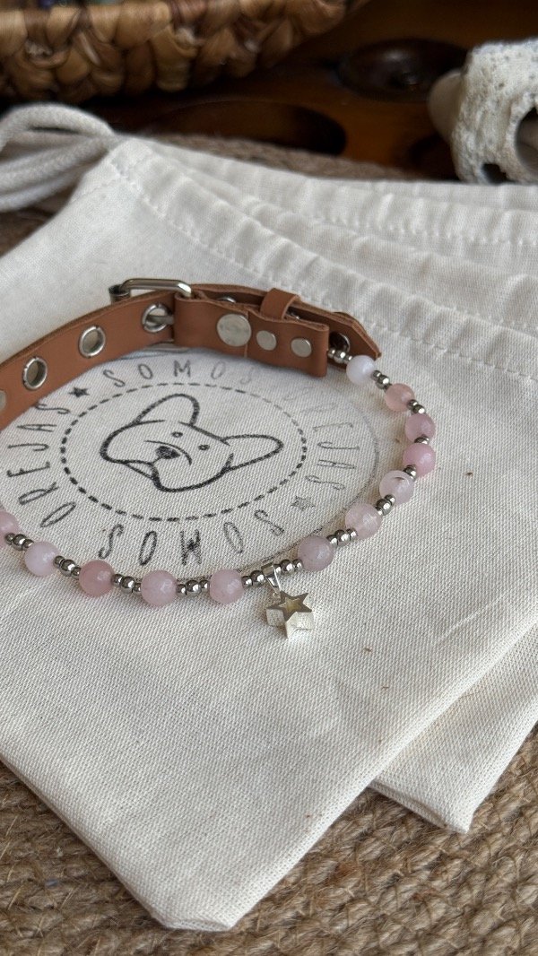 En la línea Collares Energéticos Orejas, el cuarzo rosa representa la conexión afectiva y el vínculo entre humanos y animales, pensado para acompañar el día a día de perros y gatos con un accesorio especial que combina piedra natural, diseño artesanal y significado.
