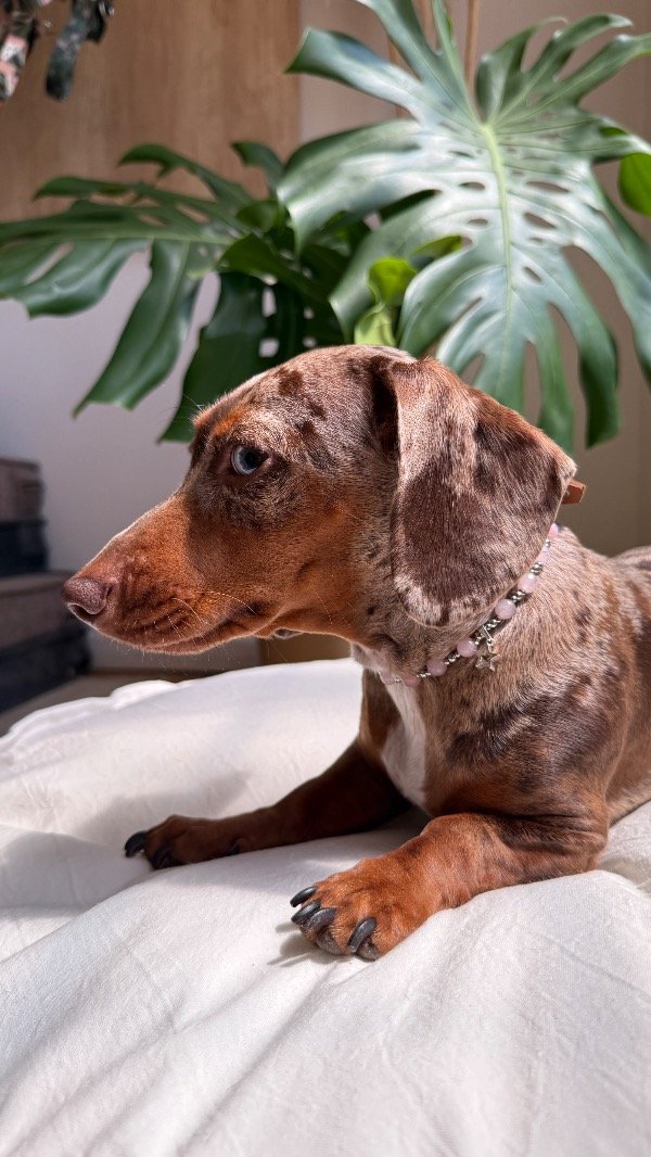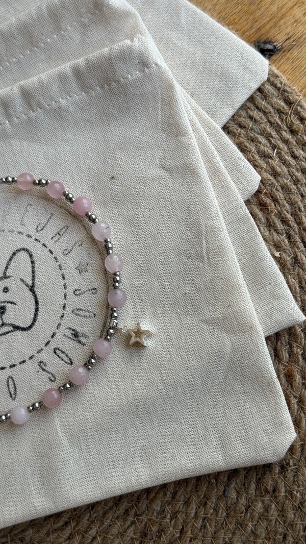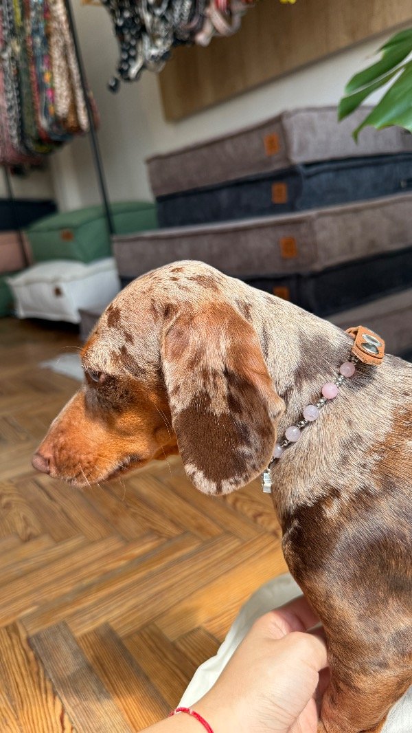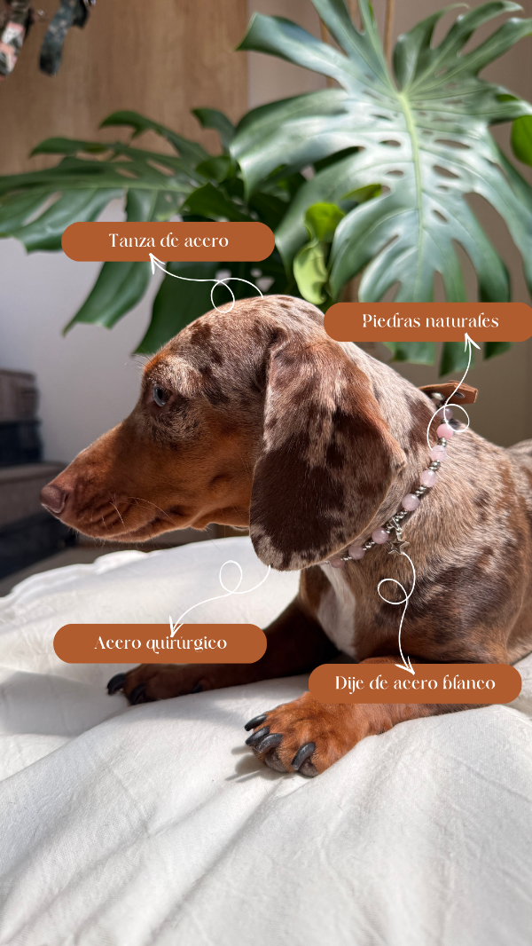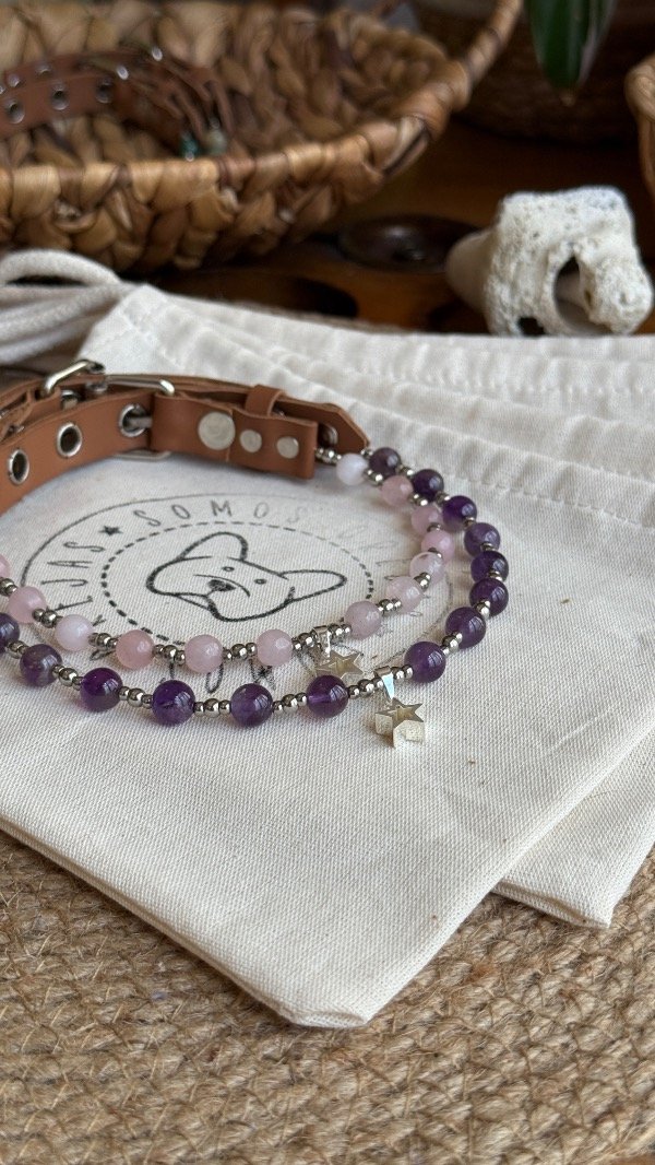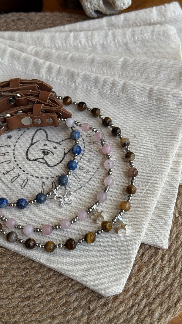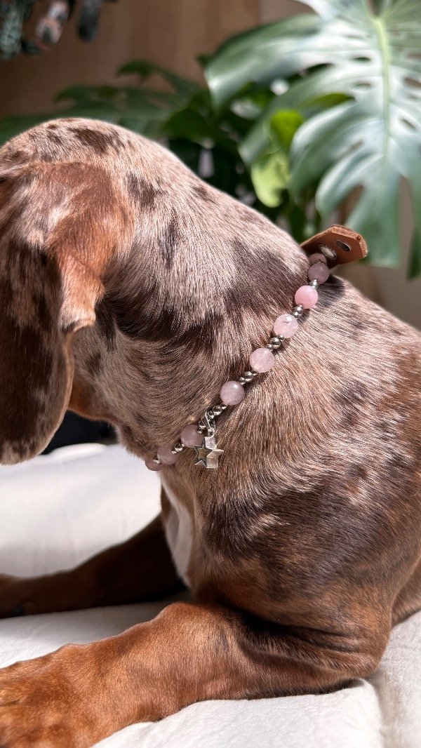 En la línea Collares Energéticos Orejas, el cuarzo rosa representa la conexión afectiva y el vínculo entre humanos y animales, pensado para acompañar el día a día de perros y gatos con un accesorio especial que combina piedra natural, diseño artesanal y significado.