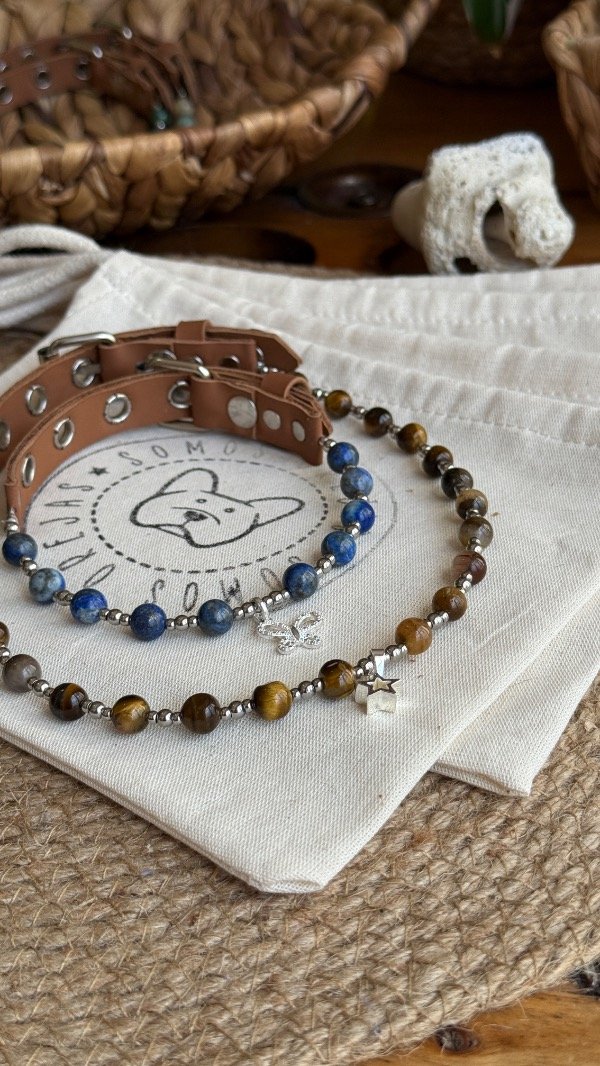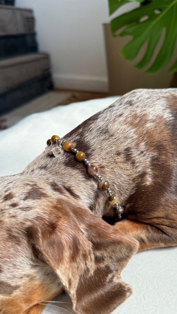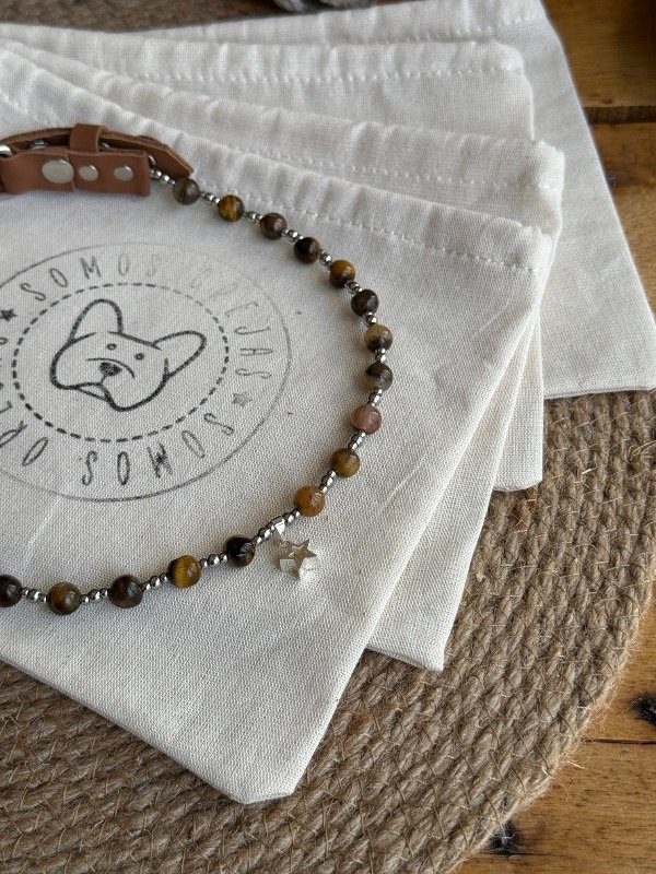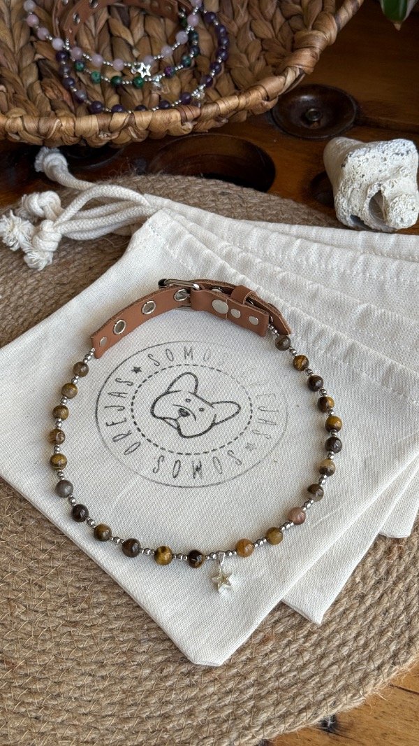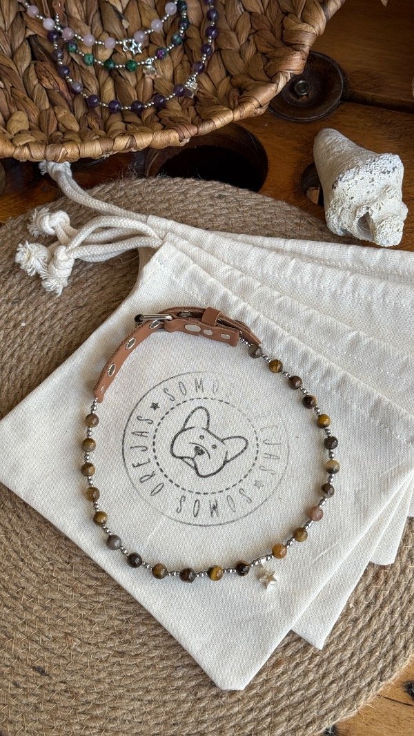 En la línea Collares Energéticos Orejas, el ojo de tigre representa firmeza y protección, pensado para acompañar el día a día de perros y gatos con un accesorio especial que combina piedra natural, diseño artesanal y significado.