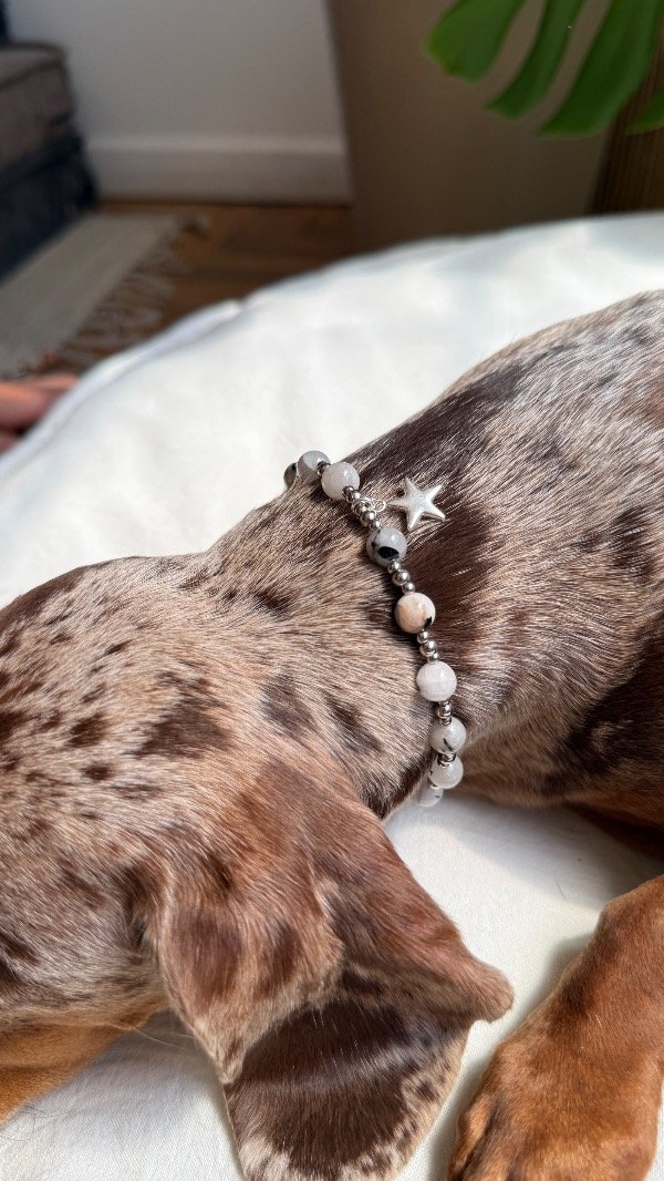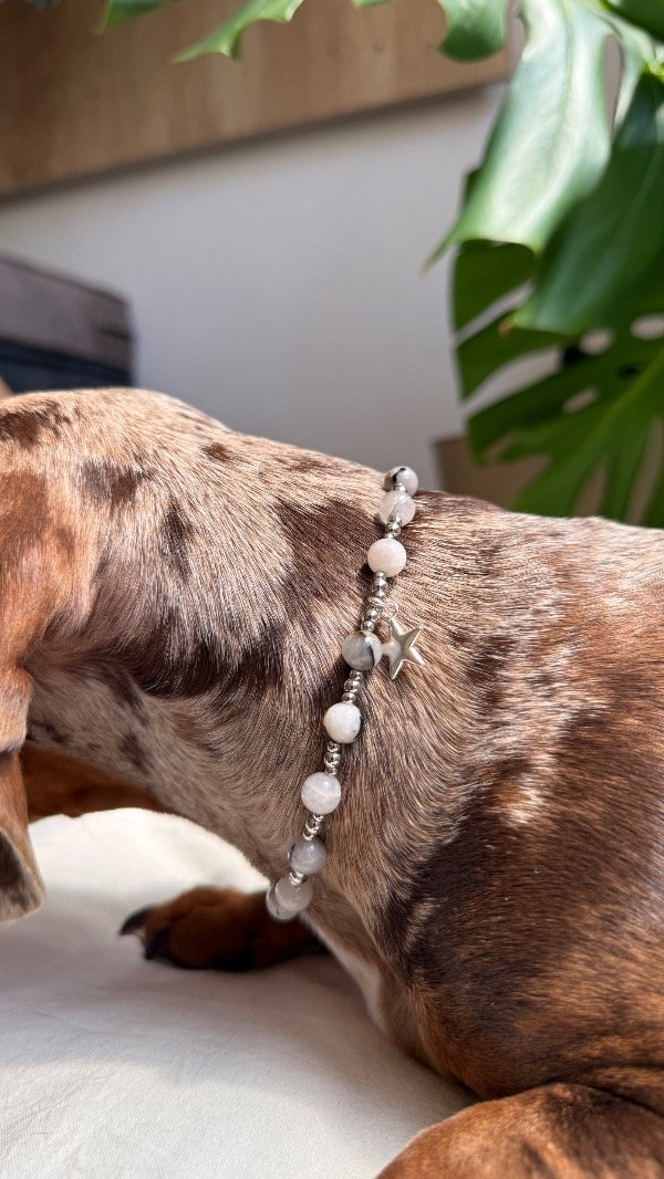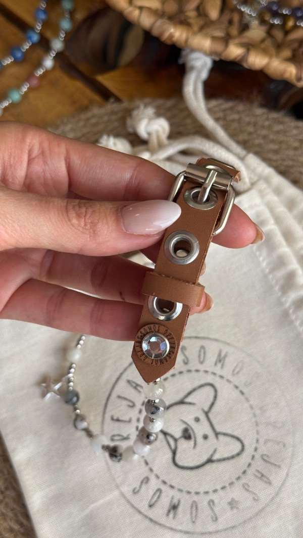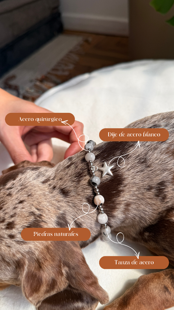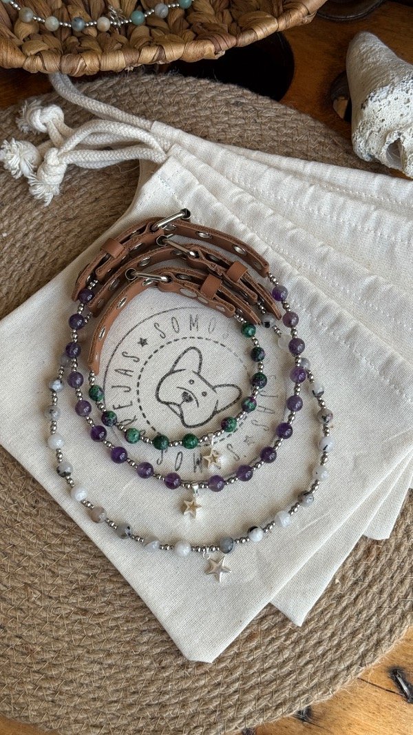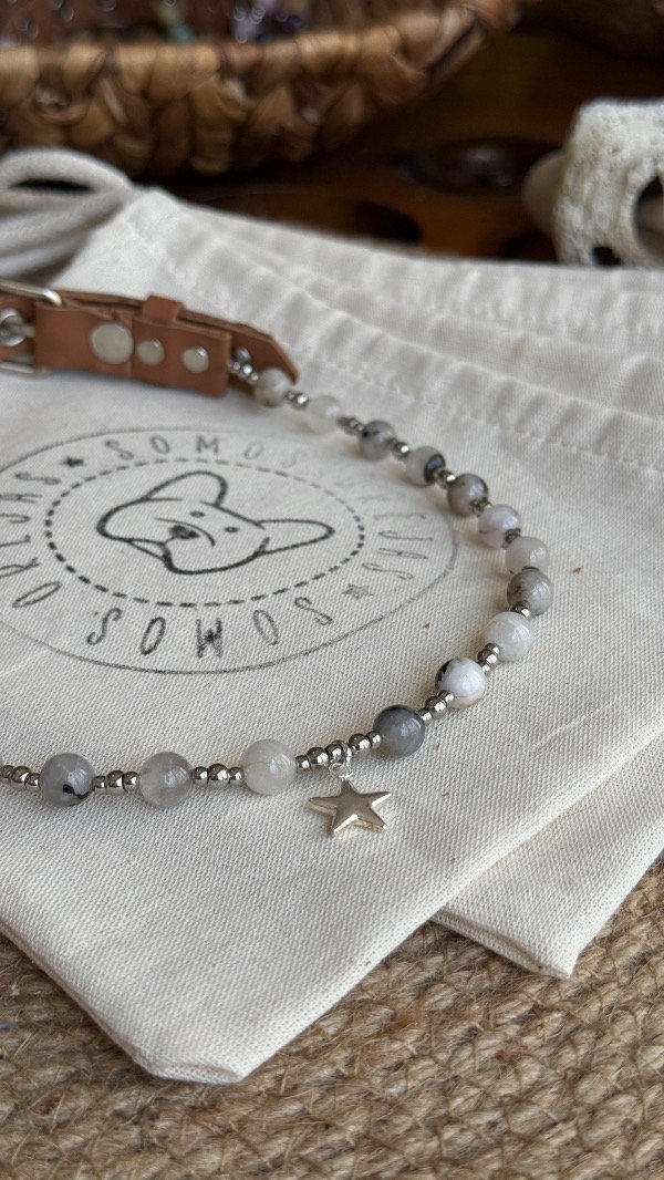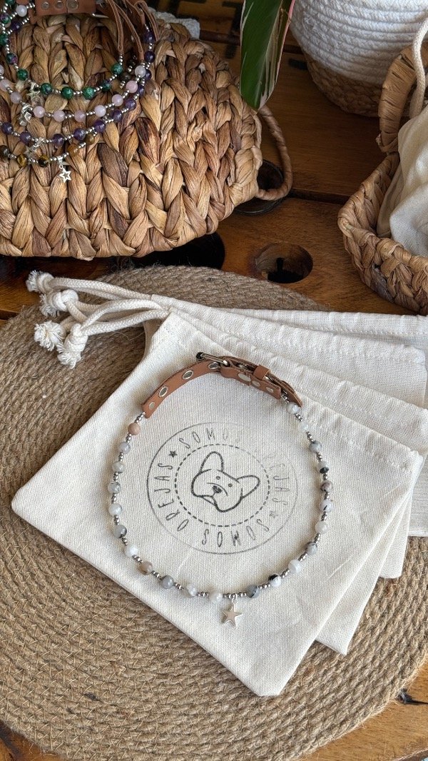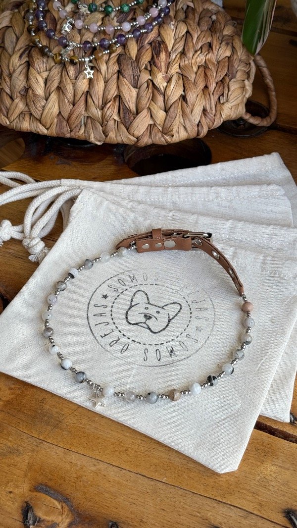Este collar está pensado como accesorio decorativo y energético, para acompañar el día a día de tu mascota con un diseño especial.