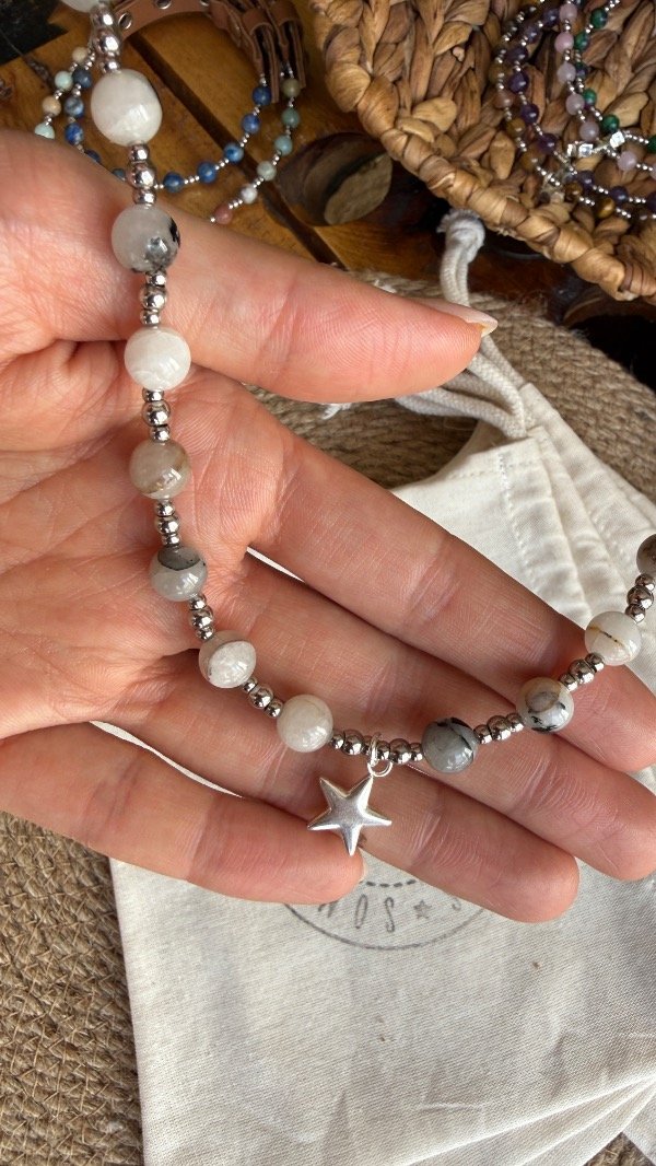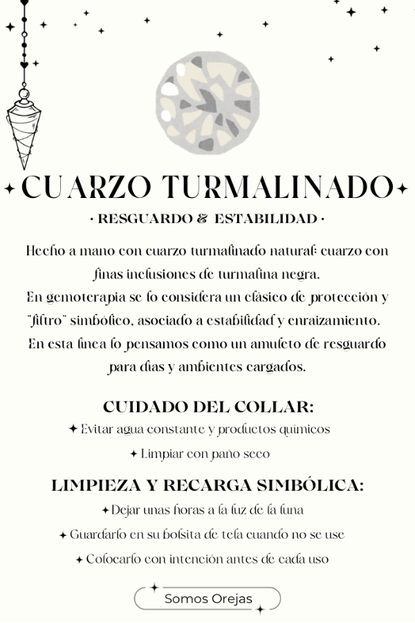 Elaborado a mano en nuestro taller con piedras naturales de cuarzo turmalinado, seleccionadas una a una. Cada collar es único: la transparencia del cuarzo y las vetas negras en su interior pueden variar, reflejando el origen natural de la piedra.